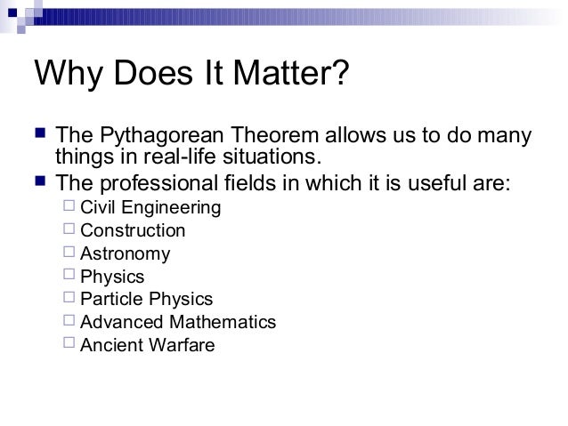 Pythagorean theorem from image.slidesharecdn.com When we simplify the exponents, we get. X2 + 152 = 172. It also has real world applications.