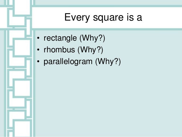 QuadAnswers from www.langfordmath.com Students often make the mistake of defining a rhombus as a rhombus is a square pushed over. it would be better to say that a square is a rhombus pushed up straight. Every square is a rectangle, but not every rectangle is a square. Thus every square is a rectangle because it is a quadrilateral with all 4 angles right angles.