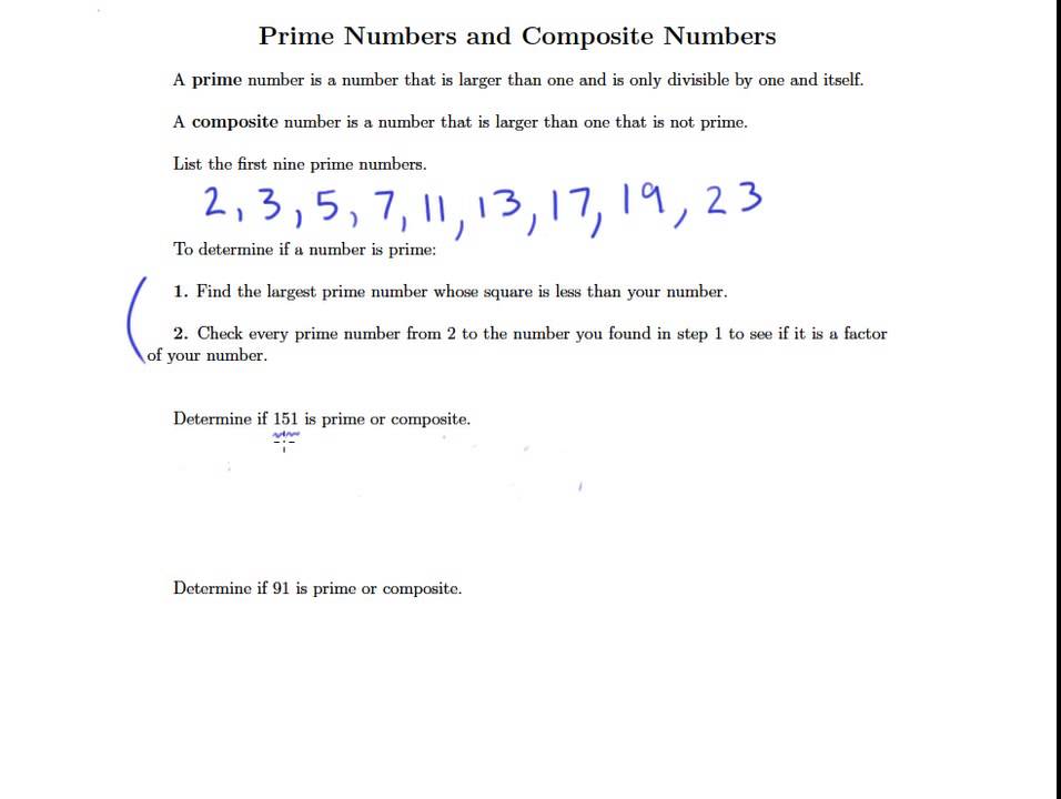 All even numbers are divisible by two and so all even numbers greater than two are composite numbers. Examples of the prime numbers less than 20 are 2, 3, 5, 7, 11, 13, 17, and 19 because the only positive integers that each of these numbers is divisible by are itself and 1, i.e. The first few prime numbers are 2, 3, 5, 7, 11, 13, 17, 19, 23 and 29. This prealgebra lesson introduces prime and composite numbers.