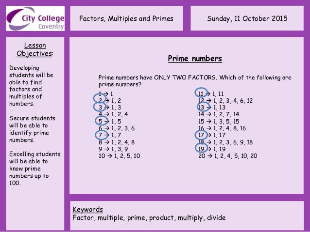 ChartWorld Tutorial - Factors from www.coe.fau.edu We write down on the left side of the with odd numbers by trying small prime factors) 5. What are the factors of 9? Factors of 9 are 1, 3.