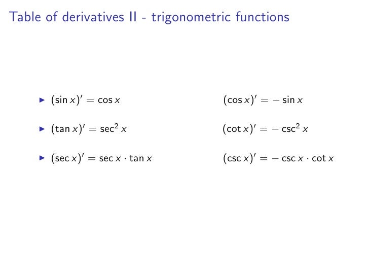 New Trig Derivative Table Most Popular. Before we start learning how to take derivative of trig functions, why don't we go back to the basics? Solve = sin(x) * 0 * 1 * 1/2 + cos(x) * 1 = cos(x) q.e.d.