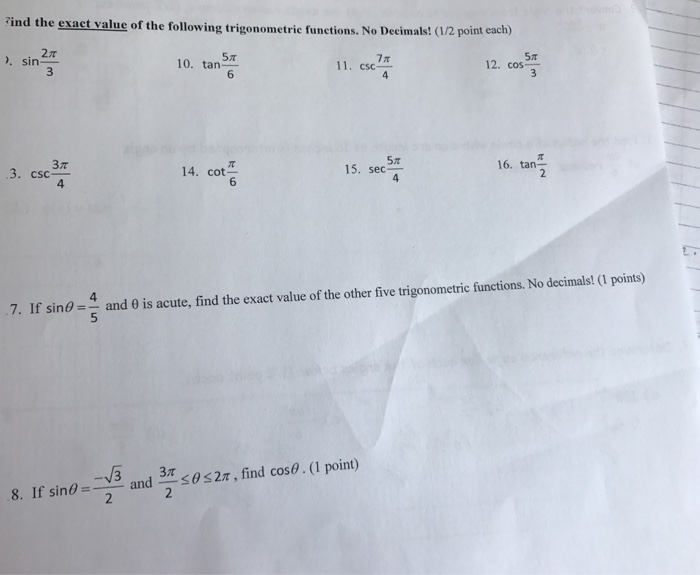 Gif. You can find exact trig functions by typing in (for example) cosecant 135 degrees into any search engine. Into two angles where the values of the six trigonometric functions are known.