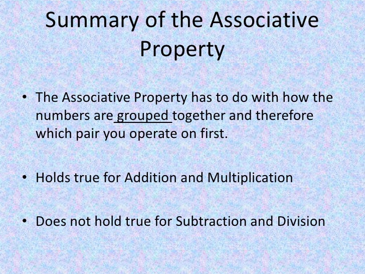 In mathematics, a binary operation is commutative if changing the order of the operands does not change the result. The two big four that are commutative are. The associative property comes from the words associate or group. it refers to grouping of numbers or variables in algebra. The associative, commutative, and distributive properties are commonly used to simplify the algebraic expression.